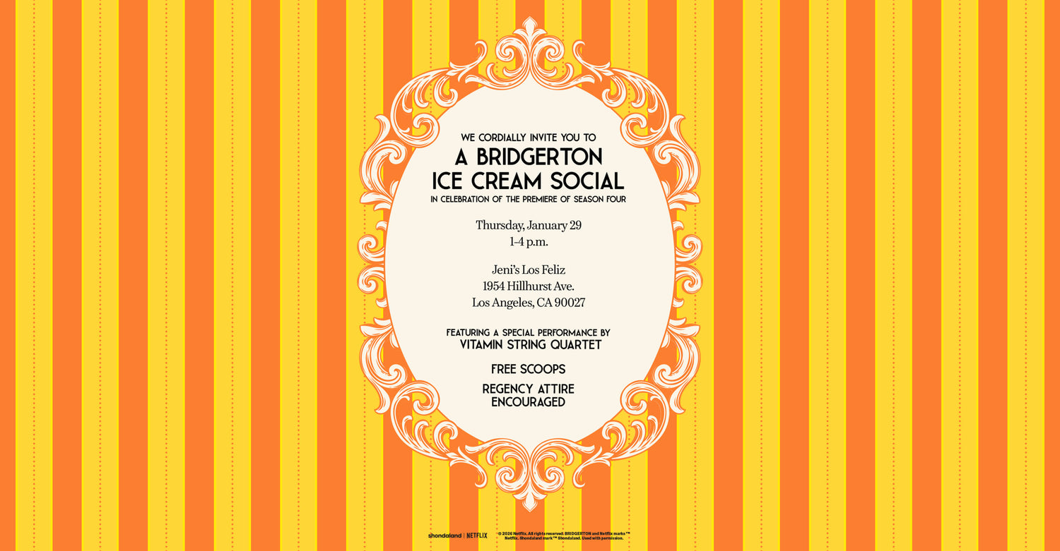 It is with the greatest pleasure that we invite you to a most illustrious event: an ice cream social to celebrate the premiere of Bridgerton’s fourth season.