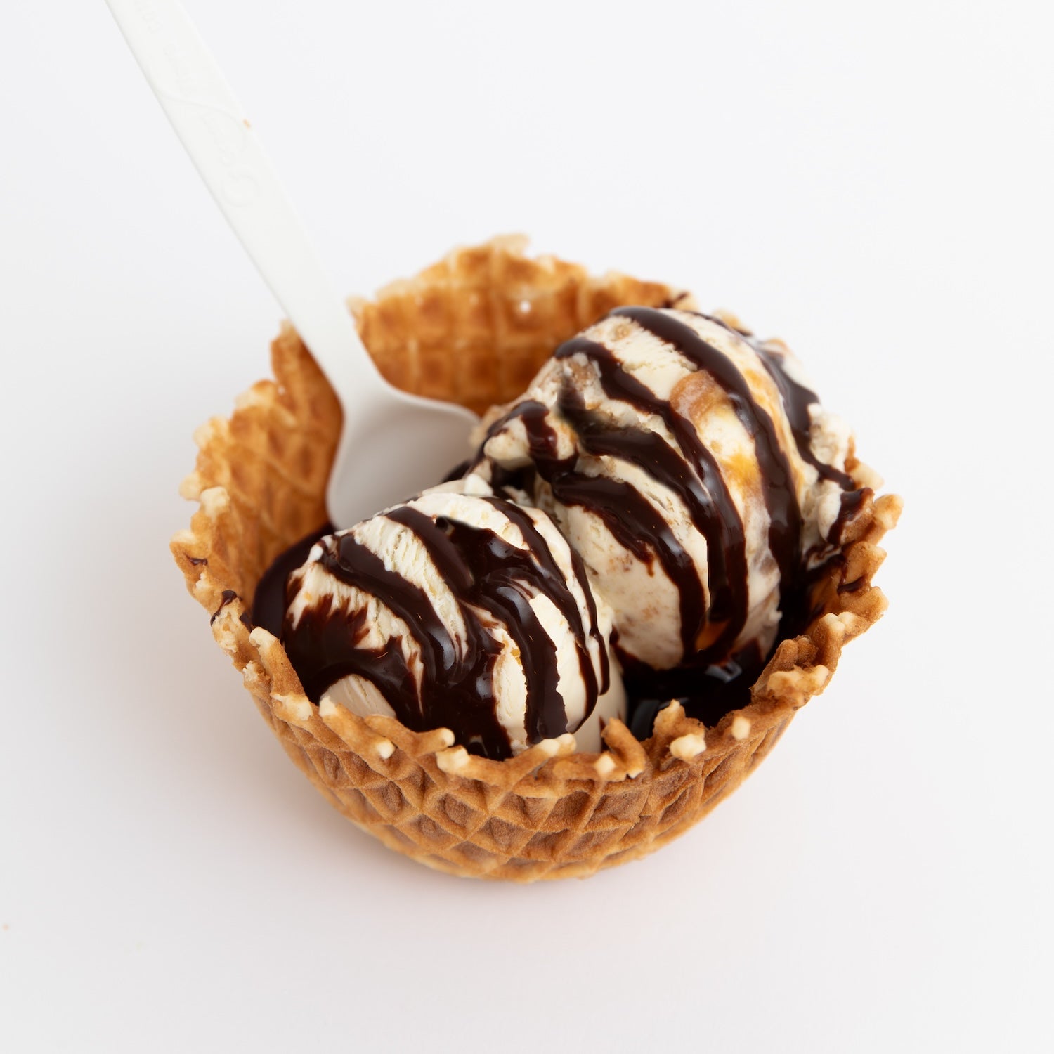 Made to spotlight our newest flavor: a sundae reminiscent of a perfectly tart apple coated in caramel, chocolate, and nuts. A half scoop each of Caramel Apple Crumble and Brown Butter Almond Brittle, topped with our decadent Sundae Fudge Sauce and served in a Buttercrisp Waffle Bowl.
