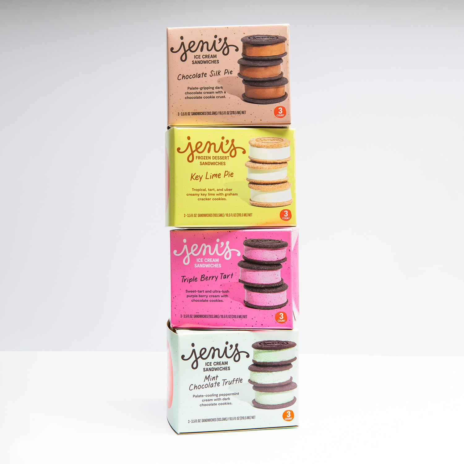 Inspired by the classic frozen confections of our childhoods. As good as you remember, but better than they ever were. Smooth, lush cream bursting with unforgettable flavor: cool mint, rich chocolate, velvety berries, punchy key lime. All caught between cookies that soften perfectly when frozen.
